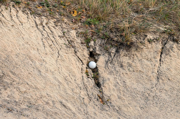 | Vraag van de maand Januari De bal ligt in een erosiegeul van de bunker, wat nu? |